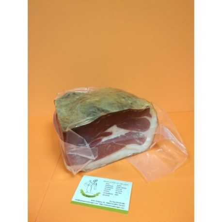 Se presenta en una pieza de jamón entero, curado con baja concentración de sal durante 18-20 meses.